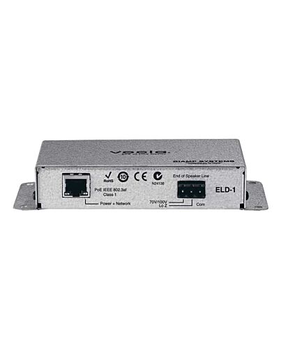 The Vocia® ELD-1 is a networked safety device for use with a Vocia amplifier (e.g. VA-8600/VA-8600c) and is an integral part of standard-compliant voice evacuation and mass notification systems. The ELD-1 tests and reports speaker line integrity between itself and the Vocia amplifier. The device can be surface mounted and utilizes IEEE-compliant Power over Ethernet (PoE) technology. The ELD-1 is compatible with both constant voltage and low impedance systems and does not rely on the speaker line as a power source.