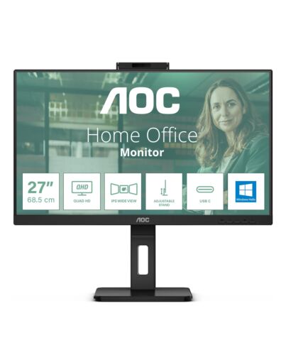The AOC Q27P3CW is a 27” flat-screen IPS monitor with a three-sided bezel design offering the features and flexibility that today’s professionals seek. Enjoy the incredible detail of QHD (2560 x 1440) resolution, which provides superior clarity and contrast for editing photos, videos, or watching movies. This el features peak 350-nit brightness and generous 178/178° wide viewing angles. To ensure smooth remote collaboration, this monitor features two built-in 5W + 5W speakers for high-quality sound and a 5MP integrated webcam supporting Windows Hello™. Monitor Q27P3CW is ready to boost your productivity with USB-C supporting Power Delivery up to 65W, data transfer and DP-alt e. Connectivity of this monitor is enhanced with USB Hub, RJ-45 & DP-out. To ensure the most efficient power consumption, an array of environmental certifications including EPA, TCO, and EPEAT complete this monitor.