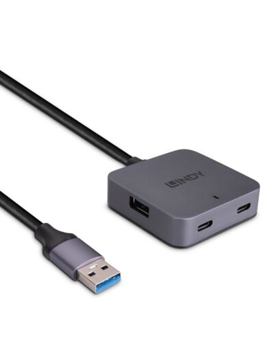 Lindy 10m USB 3.0 Hub 4 Ports, USB 3.2 Gen 1 (3.1 Gen 1) Type-A, USB 3.2 Gen 1 (3.1 Gen 1) Type-A, USB 3.2 Gen 1 (3.1 Gen 1) Type-C, 5000 Mbit/s, Black, Grey, Aluminium, Plastic, 10 m