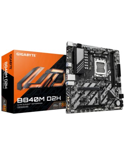 GIGABYTE B840M D2H Motherboard - AMD Ryzen 9000 CPUs, 5+2+2 Phases VRM, up to 7600MHz DDR5, 1xPCIe 4.0 + 1xPCIe 3.0 M.2, 2.5GbE LAN, USB 3.2 Gen 1, AMD, Socket AM5, AMD Ryzen 7000 Series, AMD Ryzen 8000 Series, AMD Ryzen 9000 Series, Socket AM5, DDR5-SDRAM, 128 GB