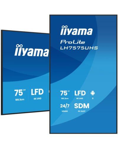 Choose non-stop high performance and reliability with the ideal all-in-one signage solution for mission critical environments. The LH7575UHS f iiyama can be operated in landscape or portrait orientation in continual around the clock environments, 24/7 without any interruption. Its versatility can be adapted to your industry’s display needs. On-board Android 11 OS means you can easily customize the display to your needs and install applications directly to it. The on-board iiSignage² (Content Management System) gives you total control of your messaging and advertising remotely and safely. The SDM Slot provides embedded PC option for total flexibility, security and control, while the FailOver feature ensures your content is always actively displayed through your choice of inputs. The built-in (and removable) WiFi ule means this series is ready for remote content delivery using your network. Now the display is also offering DP-Out f any input. With iiControl (DMS), iiShare and the integrated EShare app (wireless screen sharing) you bring effortless ideation and efficient collaboration in your enterprise or school. You can start sharing wirelessly easier than ever before.