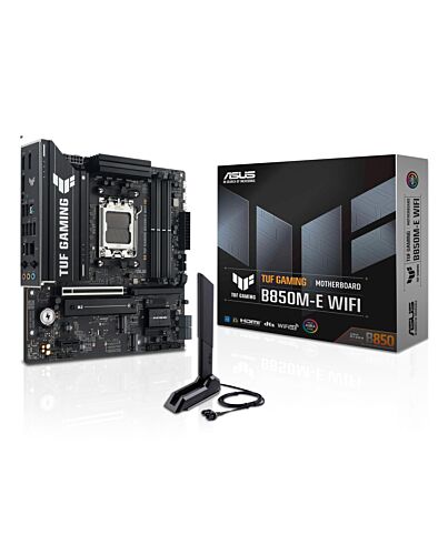 ASUS TUF GAMING B850M-E WIFI takes all the essential elements of the latest AMD Ryzen™ processors and combines them with game-ready features and proven durability. Engineered with military-grade components, an upgraded power solution and a comprehensive cooling system, this motherboard goes beyond expectations with rock-solid and stable performance for marathon gaming. TUF GAMING motherboards also undergo rigorous endurance testing to ensure that they can handle conditions where others may fail. This platform delivers the power and connectivity that advanced AI PC applications demand.