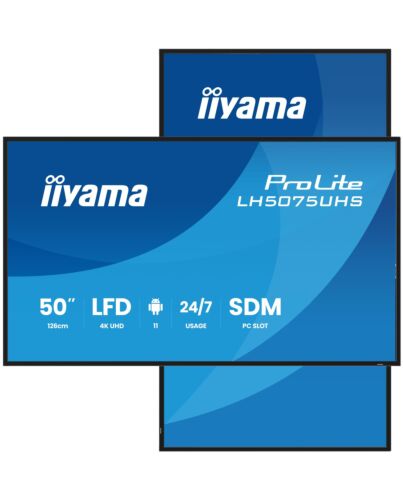 Choose non-stop high performance and reliability with the ideal all-in-one signage solution for mission critical environments. The LH5075UHS f iiyama can be operated in landscape or portrait orientation in continual around the clock environments, 24/7 without any interruption. Its versatility can be adapted to your industry’s display needs. On-board Android 11 OS means you can easily customize the display to your needs and install applications directly to it. The on-board iiSignage² (Content Management System) gives you total control of your messaging and advertising remotely and safely. The SDM Slot provides embedded PC option for total flexibility, security and control, while the FailOver feature ensures your content is always actively displayed through your choice of inputs. The built-in (and removable) WiFi ule means this series is ready for remote content delivery using your network. Now the display is also offering DP-Out f any input. With iiControl (DMS), iiShare and the integrated EShare app (wireless screen sharing) you bring effortless ideation and efficient collaboration in your enterprise or school. You can start sharing wirelessly easier than ever before.