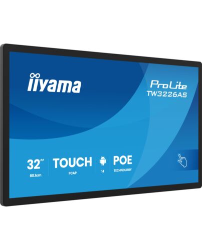 The ProLite TW3226AS-B3P is a smart and intuitive 31.5" Touch panel PC, designed for high-traffic environments such as meeting rooms, info points, or hospitality spaces. Its 10-point PCAP touch technology ensures smooth and precise interaction. Powered by Android 14, and equipped with powerful hardware, it allows easy installation of apps directly on the device - making it a all-in-one solution. Thanks to Power over Ethernet (PoE), both power and data are delivered through a single cable, simplifying installation and reducing additional cables. With a built-in quad microphone and 5W speakers, the TW3226AS-B3P delivers seamless, ern interaction in any smart space. Additionally, it integrates effortlessly with iiSignage² , iiyama’s Content Management System (CMS), giving you full control over your messages and advertising, in landscape portrait and face-up position.