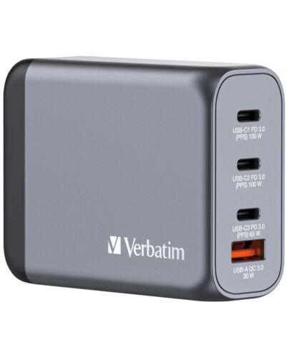 Verbatim GNC-100 GaN Charger 100W with 2 x USB-C PD 100W / 1 x USB-C PD 65W / 1 x USB-A QC 3.0 (EU/U