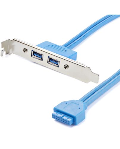 The USB3SPLATE 2-Port USB 3.0 A Slot Plate converts the USB pins on the USB 3.0 motherboard header to 2 standard USB 3.0 A-type ports. The plate can be mounted on the rear panel of a computer case, adding two USB 3.0 A female ports for simple connection to USB peripheral devices.