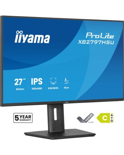 The ProLite XB2797HSU is perfect if you want a compact, high-performance display that fits seamlessly into a multi-monitor setup. The four-side slim bezel gives you a clean, ern workspace and uninterrupted visuals across screens. You’ll enjoy sharp, accurate colours and wide viewing angles thanks to the IPS panel, while the 120Hz refresh rate keeps everything smooth and responsive. Whether you're working on documents, editing content or browsing, flicker-free technology and a blue light reducer help protect your eyes during long sessions. Adjust the screen to suit your posture with a fully ergonomic stand offering 150cm height adjustment, tilt, swivel and pivot. Built-in speakers, a four-port USB hub, HDMI, DisplayPort and a headphone socket keep your setup simple and efficient. And with EPEAT and TCO10 certifications and an Energy label C, you’re choosing a monitor that supports sustainability without compising on performance.